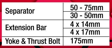2 separators - Medium 50-75mm / Small 30-50mm 175mm thrust bolt 14 & 17mm Extensions