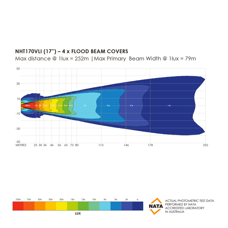 - Max Primary Beam Width @ 1 lux (Flood): 79m