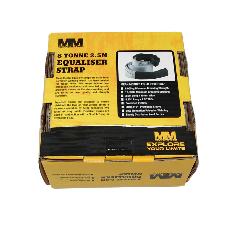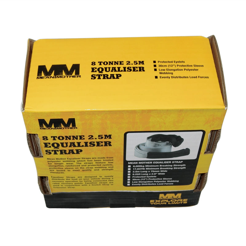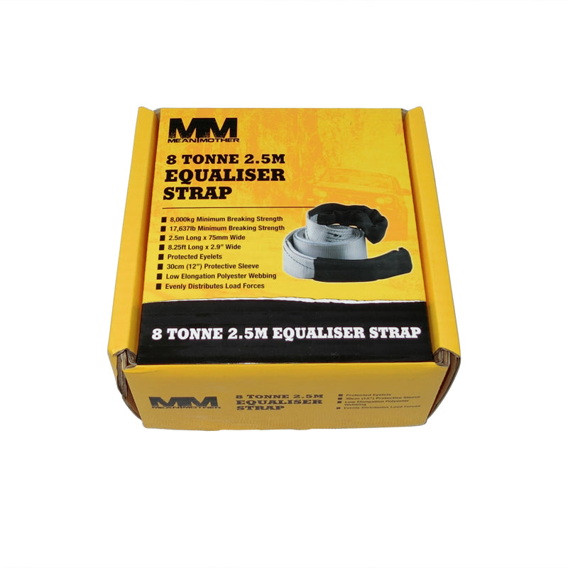 - 2.5m x 75mm 8000kg minimum breaking strength.