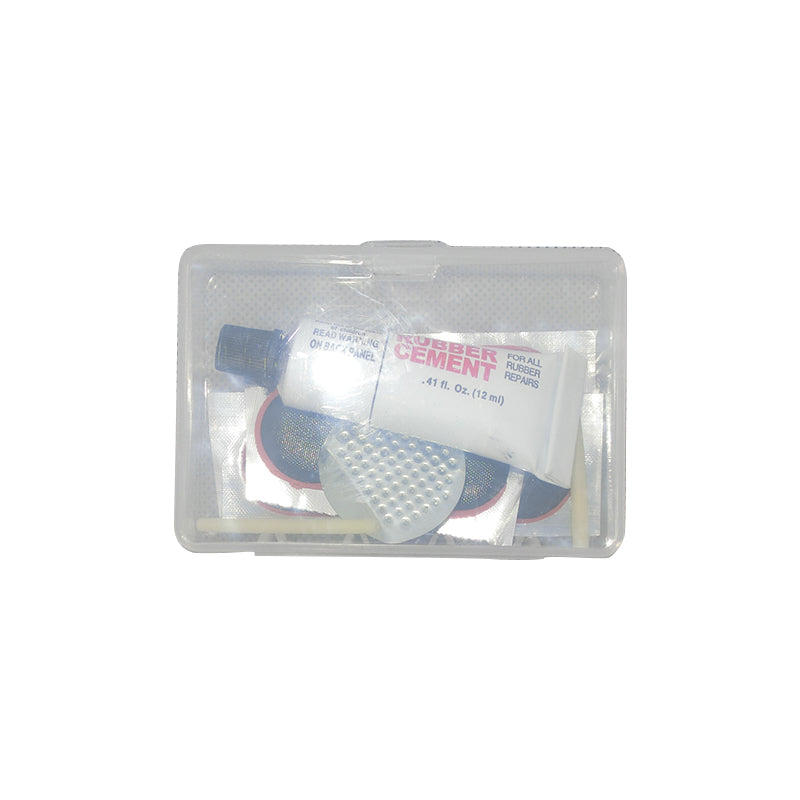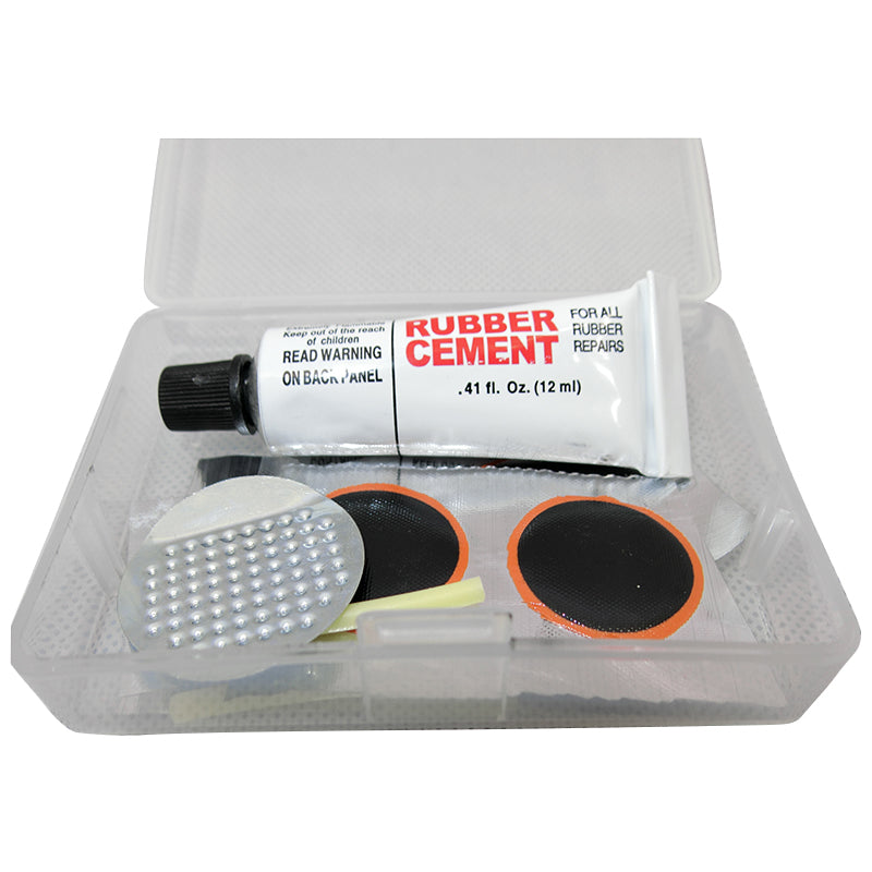 Kit includes a tube of rubber glue, rubber repair patches, a tyre preparation tool.