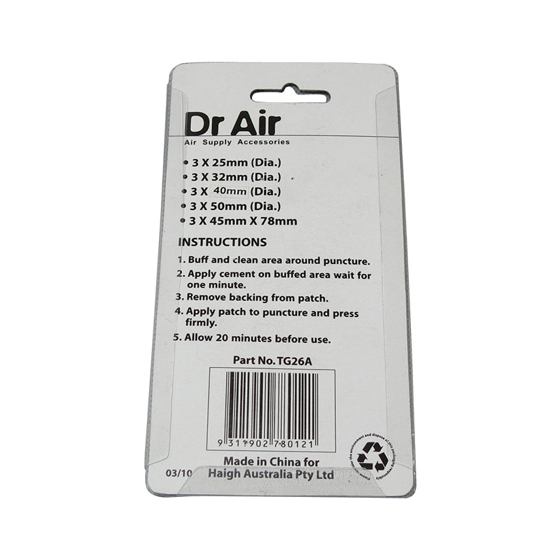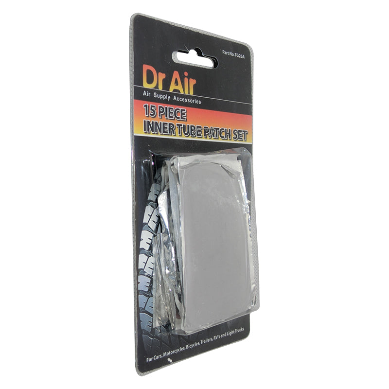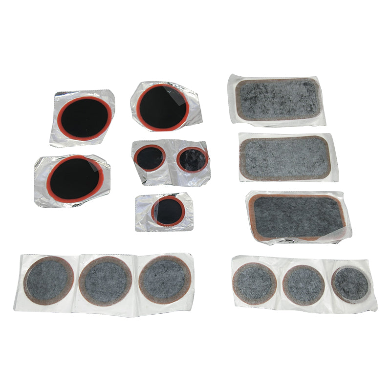 Selection of assorted patches for the repair of tyre tubes. There are five sizes to suit a variety of applications from push bikes to tractors all neatly packed in a full colour blister card.